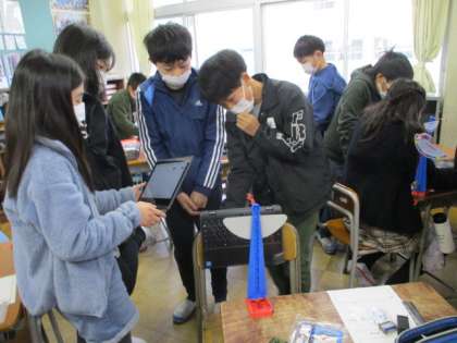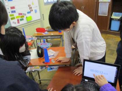 ふりこのきまりの学習をしています。グループで役割を分担しながら、ふりこの長さを変えて1往復する時間を調べていました。回数を数える子、端末で時間を計測する子、実験の様子を動画で撮影する子、結果を端末に入力する子など、力を合わせて真剣に取り組んでいます。