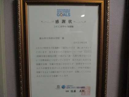 ユネスコ協会からいただいた感謝状は、会議室前に掲示してあります。