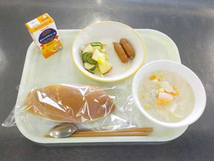 今日の献立は、米粉コッペパン、ウインナー、白菜とりんごのサラダ、コーンチャウダー、オレンジジュースでした。白菜とりんごのサラダには、りんごが皮付きではいっていたので、色鮮やかでとてもきれいでした。コーンチャウダーには鶏肉と野菜がたくさん入っいて、とてもおいしかったです。ウインナーとオレンジジュースも付いて、みんな嬉しそうに食べていました。
