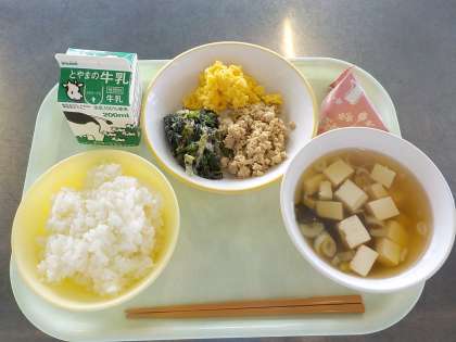 今日の給食 公開日 2022/02/24 更新日 2022/02/24 給食室より 今日は、ひなまつり献立でした。メニューは、ごはん、そぼろ丼(鶏そぼろ、炒り卵)、よごし、すまし汁、ひなあられ、牛乳でした。炒り卵やよごし、すまし汁などが色鮮やかで、ひな祭りらしい献立でした。よごしは、黒ごまの香りがとても良かったです。