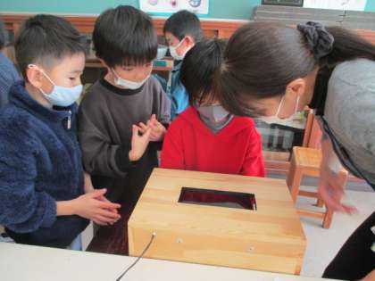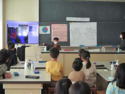 コロナ禍において、進んで手洗いをする子供が多い中、本当にきれいに洗えているか、手洗いはなぜ大切かを考える授業を行いました。ブラックライトを使い、洗い残しを光で目にした子供たちは、養護教諭から正しい洗い方を教えてもらい、真剣に洗い直す姿が見られました。「オオカミの手で爪のばい菌も退治したいです」「きれいなハンカチをいつも持ってふくようにしたいです」という声が聞かれました。