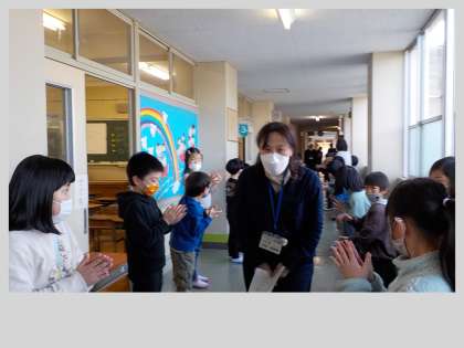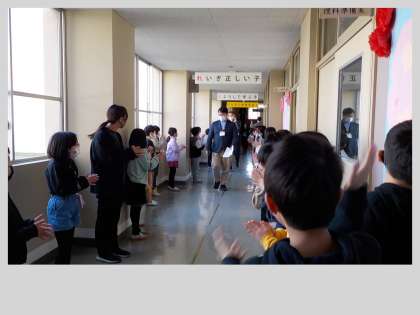 在校生は卒業式の様子を教室で見る形になるため、巣立ちの会に向かう6年生を廊下で見送ることにしました。1年生から5年生の前を歩いていく6年生に感謝の気持ちを拍手で表現したいと思います。