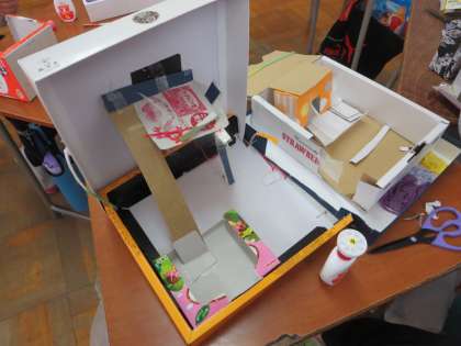 図画工作科で「ともだちハウス」という学習に取り組んでいます。子供たちは、小さな友達が喜ぶ家を考えて、家から持ち寄った箱を使って家を作っていました。エレベーターを作ったり、ベッドを取り付けたりするなど、どの家にも一人一人の工夫があってとてもすてきです。