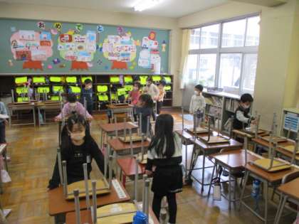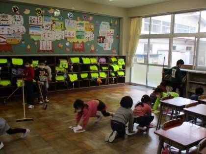 みんなで協力しながら、教室やろうかをきれいにしています。重たい机も気を付けて運んでいます。ぞうきんがけもがんばっています。