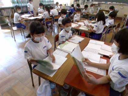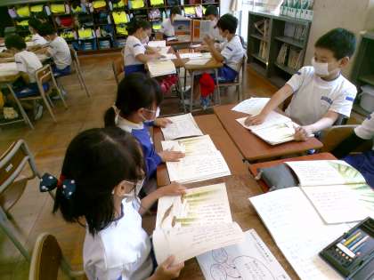 「ふきのとう」の音読発表会に向けて、叙述に基づいた登場人物になりきるための工夫を考えてきました。「『ささやいています。』の所はささやくように小さな声で読んでみよう」「お日さまのところは、春風が起きるように元気に読みたいな。」などいろいろなことを考えながらグループで音読練習に取り組んできました。今日から発表会がはじまりました。動画で録画したので、今度見ることを楽しみにしている子供たちです。