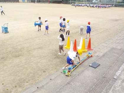 3、4年生 スポーツフェスティバル 公開日 2022/05/14 更新日 2022/05/14 3年生の活動 5月15日(日)の「スポーツフェスティバル」へ向けて、最後の練習が行われました。 3、4年生合同チームによる「台風の目」は、本番さながらの団結した動きが輝いていました。 競技を終えた後には、3年生の代表がコーンや棒を片付けていました。 本番、どの団が勝利するのか、とても楽しみです。