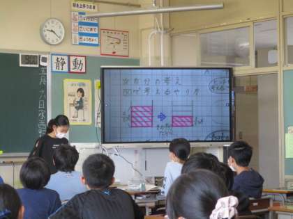 自分の考えをノートを拡大して見せながら説明したり、友達の考えと比べながら表現したりしています。分からないことは、クラスみんなで解決しようと聞き合っています。自ら学ぼうとする姿がすてきですね。