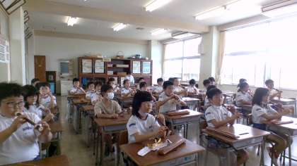 リコーダーを演奏する時の姿勢や持ち方等を丁寧に教えていただきました。素敵な演奏を聴き、「はやく素敵に演奏できるようになりたいな」「タンギングが大事なんだね」と学んだことを生かしていこうとする声がたくさんありました。教えていただいたことをこれからの音楽科の学習で生かしていきます。
