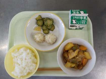今日の献立は、ごはん、えび包子、華風和え、酢豚、牛乳でした。華風和えは、富山県産のおいしい野菜「きゅうり」と大根を使った和え物で、ごまのよい香りがしておいしかったです。全7種類の食材が入った酢豚は、とても食べ応えがあり、ごはんがよく進みました。