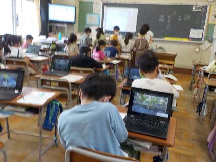 生活科の授業では、現在の姿を撮影したり、くきの長さをはかったりすることで、野菜が大きく育つ様子を確かめています。