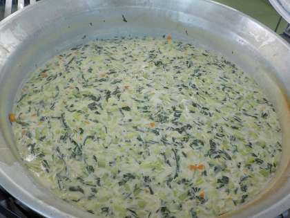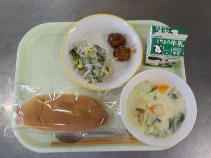 今日の献立は、コッペパン、ミートボール、水菜のサラダ、ほたてのクリーム煮、牛乳でした。ミートボールは子供たちの人気が高かったです。今日の水菜サラダは、レモンの酸味を効かせた味付けで、おいしかったです。ほたてのクリーム煮は、ほたてのだしがよく出ていておいしい一品でした。パンにつけて食べている子供の姿が多く見られました。