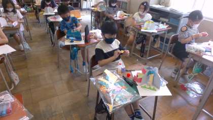 子供たちは、自分のイメージしたものを作ろうと作品づくりに没頭しています。すごい集中力です。どんな作品になるか完成が楽しみです。