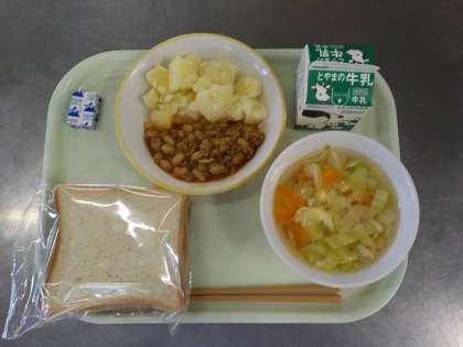 今日の給食 公開日 2022/06/08 更新日 2022/06/08 給食室より 今日の献立は、食パン、チリコンカン、こふきいも、キャベツスープ、ポケットチーズ、牛乳でした。チリコンカンは、ひき肉と玉ねぎ、白いんげん豆が入ったケチャップ味の炒め物で食べやすかったです。食パンにはさんで上手に食べている子供の様子が見られました。 キャベツスープは、具材たっぷりで、ウインナーとコーンのうま味もしっかりスープに出て、とてもおいしかったです。