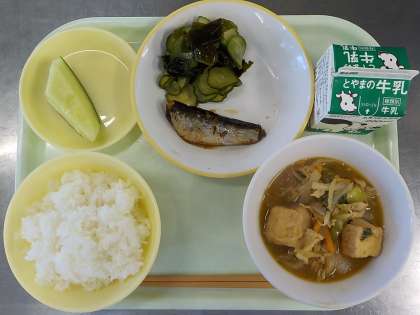 今日の献立は、ごはん、いわしの土佐煮、酢の物、厚揚げのみそ炒め、メロン、牛乳でした。酢の物は、定番のきゅうりとわかめの酢の物で、さっぱりとおいしかったです。厚揚げのみそ炒めは、濃厚な赤味噌仕立てでご飯がよく進みました。初夏を感じさせるメロンは、甘みがあって食後のデザートにちょうどよかったです。