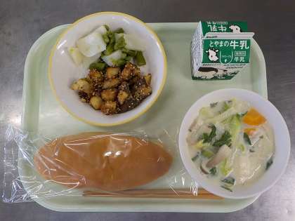 今日の献立は、米粉コッペパン、魚とレバーのえごまだれからめ、かぶのサラダ、中華クリームスープ、牛乳でした。米粉パンは、弾力のある食感で、お米の甘みが感じられました。魚とレバーのえごまだれからめは、ごまが香ばしく、レバーの苦手な子供にも食べやすい味付けになっていました。かぶのサラダは、かぶの歯触りが良かったです。中華クリームスープは、具がたっぷりで、やさしい味付けで子供たちにも人気でした。