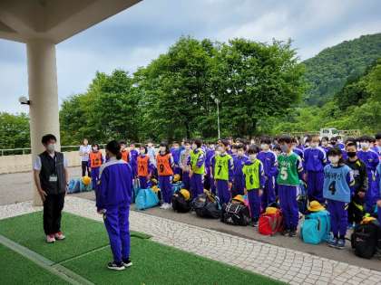 立山青少年自然の家にて、入所式後に、すぐ来拝山登山に出発しました。この山の頂上で昼食をとります。
