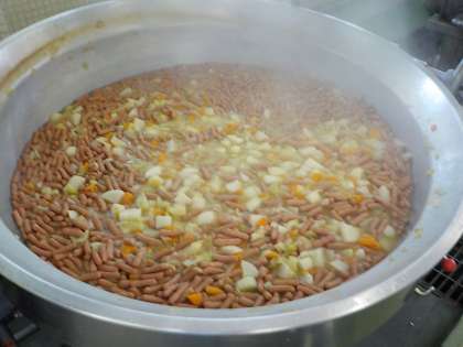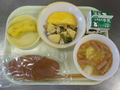 今日の献立は、ココアコッペパン、チーズオムレツ、ひよこ豆のオリーブオイル炒め、ポトフ、バナナ、牛乳でした。ココアコッペパンは、今回初めて給食に登場しました。ココアが練り込まれたパンで、甘みがありました。チーズオムレツは食べ応えがあり、ひよこ豆のオリーブオイル炒めは、にんにくの香りが食欲を誘いました。ポトフは、セロリー、玉ねぎ、人参等具だくさんで、大きなカブがごろっと入っていました。1年生の教室では、授業で「大きなかぶ」を学んだばかり。ポトフの中のかぶが話題になっていました。