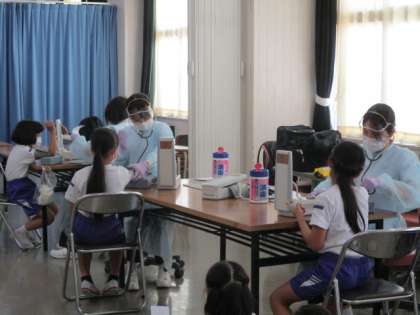 4年生が、涼しくした部屋ですこやか検診を実施しています。10歳を過ぎると大部分の子供に動脈硬化性の脂肪沈着が始まるので、早く発見し、なるべく早く生活習慣面での対応を図るために行っています。初めて血圧を測ったり、採血をしたりする子もいて、みんなドキドキしながら静かに対応しています。
