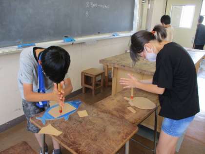 糸のこを使って、曲線も上手に切っています。きりで穴をあけるのにも一苦労。水彩で色付けして、家庭でも活用できるホワイトボードをつくっています。