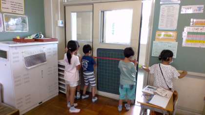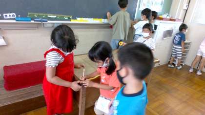 ながさくらべ 公開日 2022/07/06 更新日 2022/07/06 1年生の活動 算数科の「どちらがながい」の学習で、教室にあるいろいろなものの長さをテープに写し取って調べました。思う以上に長いものがあることに驚きながら、協力して調べました。