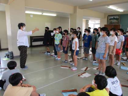 音楽指導 公開日 2022/07/06 更新日 2022/07/06 5年生の活動 講師の先生をお招きして、合唱・合奏指導を受けました。歌う姿勢、歌が上手になる方法を教わりました。声の響きがとても美しくなり、子供たちも手応えを感じたようです。