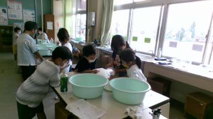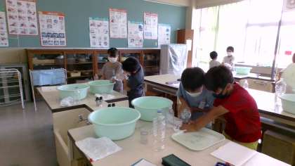 算数の学習で、デシリットルの容器を使って自分の持ってきた容器やペットボトルにどれぐらい水が入るのか調べてみました。友達と協力しながら慎重に水を入れたり、数を間違えないようにノートにメモしたりしながら調べました。