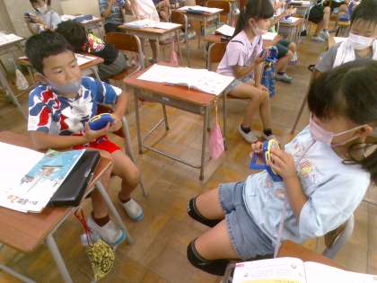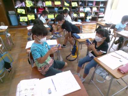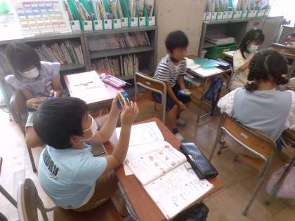 算数ボックスの中にある時計を使って、今の時刻から○分前や○分後の時刻を考える問題を出し合いました。これからも今回のような場を設けたり、実際の時刻を確かめたりすることで、子供たちに時刻や時間が定着するようにしていきます。