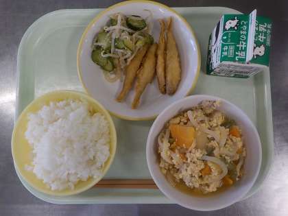 今日の給食は、ごはん、わかさぎのフリッター、甘酢和え、高野豆腐の卵とじ、牛乳でした。長い夏休みが明けて、以前よりも給食の食べられる量が増えたと回答する児童が多く見られました。健やかに成長してほしいと思います。