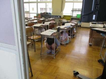 地震が発生したという想定で、すばやく行動を中止し、身の安全を確保するという内容で訓練を行いました。地震の音がなると、子供たちはすばやく机の下に入り、安全を確保していました。教職員も、子供の安否や避難経路の確認を行いました。いつ災害が発生するか分かりません。いざというときに備えた訓練を、今後も行っていきます。