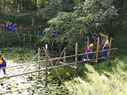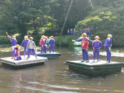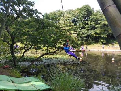 池ジャングル、竹ジャングル、ターザンロープ、いかだ乗りで楽しく活動しています。