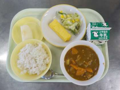 今日の献立は、麦ごはん、カレーライス、卵ロール、コールスローサラダ、梨、牛乳でした。今日のカレーライスも、子供たちに人気で美味しそうに食べる姿がたくさん見られました。呉羽特産の幸水梨は、とても甘かったです。