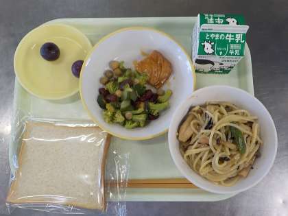 今日の給食 公開日 2022/09/14 更新日 2022/09/14 給食室より 今日の献立は、食パン、照焼きチキン、ビーンズサラダ、ベーコンとひじきの和風スパゲッティ、巨峰、牛乳でした。スパゲティは、ベーコンのうま味と程よい塩加減で美味しかったです。巨峰も果汁たっぷりでした。
