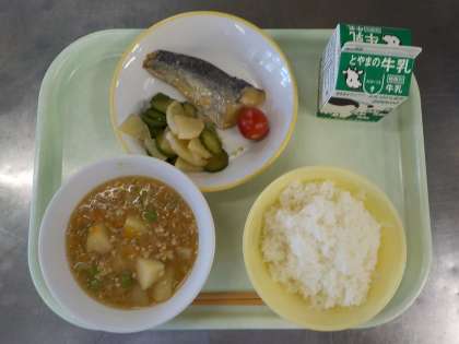 今日の献立は、ごはん、鰆の西京焼き、華風和え、ミニトマト、じゃがいものそぼろ煮、牛乳でした。華風和えは、ごま油の香りとピリッとした唐辛子の風味が効いて美味しかったです。