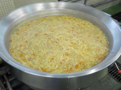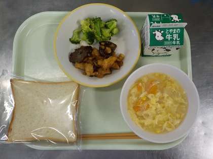 今日の献立は、食パン、鶏肉とレバーのマーマレードソースからめ、ゆでブロッコリー、コーンとたまごのスープ、牛乳でした。鶏肉とレバーのマーマレードソースは、レバーの苦手な人にも食べやすく味付けされていました。美味しかったです。