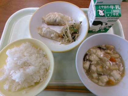 今日の献立は、ご飯、エビと豆腐のうまに、焼餃子、ナムル、牛乳でした。栄養もあって美味しかったです。 K/Y