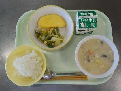 今日の献立は、ごはん、オムレツ、アスパラサラダ、秋の香りシチュー、牛乳でした。秋の香りシチューは、秋の味覚の「さつまいも」と「きのこ」が入り優しい味付けで食べやすかったです。
