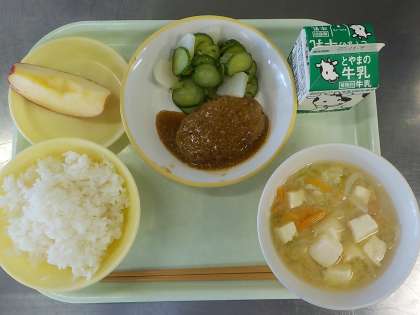 今日の給食 公開日 2022/11/02 更新日 2022/11/02 給食室より 今日の献立は、ごはん、和風煮込みハンバーグ、きざみ和え、豆腐のみそ汁、りんご、牛乳でした。和風ハンバーグは、ごまがたっぷり入ったタレがかかっていて食べやすかったです。ごはんにもよく合いました。