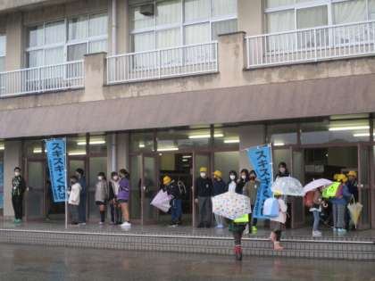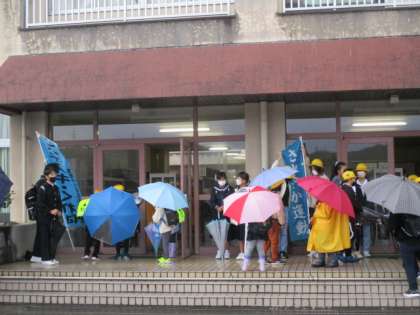 冷たい雨の降る朝でしたが、本校を卒業した中学生が、朝のあいさつ運動に来てくれています。生活委員会や6年生のあいさつチームも児童玄関に立ち、元気なあいさつをよびかけています。