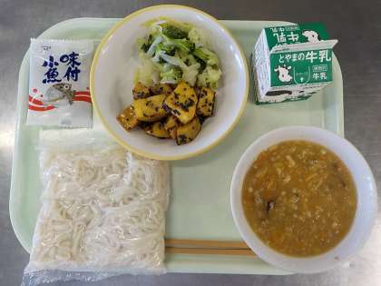 今日の献立は、ソフト麺、ソフト麺の肉みそ、大学いも、野菜のドレッシングあえ、味付け小魚、牛乳でした。ソフト麺の肉みそは、子ども達にとても人気でした。大学芋も、たれとよく絡んでおいしかったです。