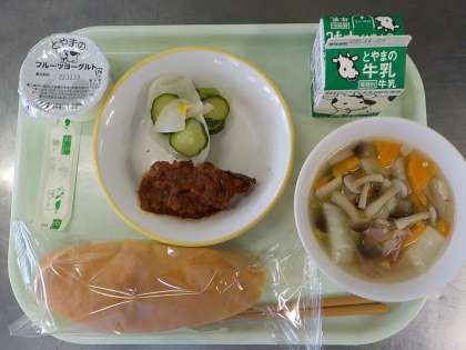 今日は、「学校給食とやまの日」献立を実施しました。米粉パン、しいらのイタリアンえごまソースかけ、かぶのゆずサラダ、はくさいスープ、ラフランスヨーグルト、牛乳でした。富山市産のえごまとフルティカトマトを使った、しいらイタリアンえごまソースかけは濃厚トマトソース味でとてもおいしかったです。食べキリン3日目、7クラスがすべてのメニューを完食していました。とても嬉しく思います。