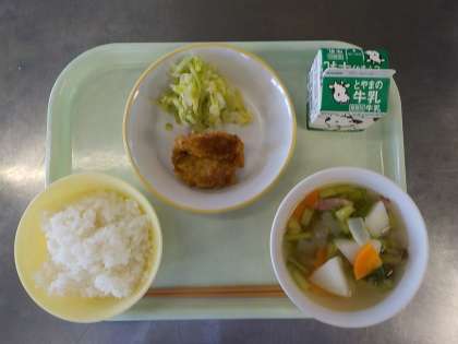 今日の給食は、ごはん、ポークパコラ、ゆでキャベツ、かぶのスープ、牛乳でした。旬のカブがたっぷり入った、かぶのスープはベーコンのうまみと野菜の甘みが絶妙のスープでした。おいしかったです。