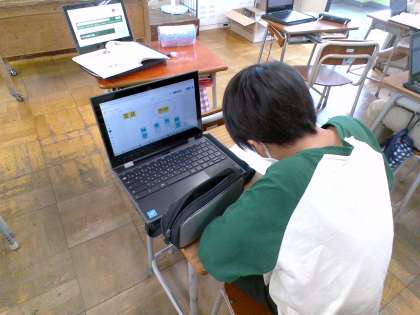 国語科の学習では、自分が調べた伝統工芸についてリーフレットを作っています。その伝統工芸のよさが伝わるよう、文の組み立てを端末を活用しながら考えました。教科書の例文と端末に入力したものを見比べながら、自分だけのリーフレット作りをがんばっています。