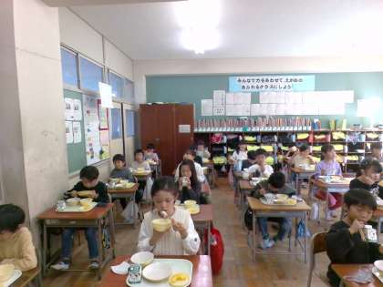 一日のうちで楽しみな時間の一つが、給食です。美味しい給食をいただきながら、お昼の放送を楽しんで聞いています。放送は一度で聞けるように子供たちは意識しています。大切なお知らせを聞き逃さないように、自分でしっかりと聞こうとしている姿が見られます。