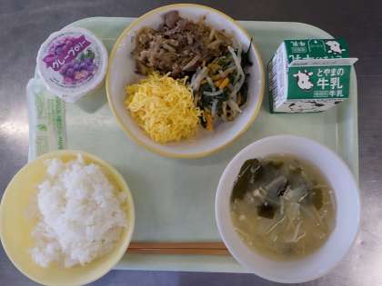 今日の給食 公開日 2022/12/01 更新日 2022/12/01 給食室より 今日の献立は、ごはん、ビビンバ(焼き肉、ナムル、錦糸卵)、みそ汁、ぶどうゼリー、牛乳でした。具だくさんのビビンバは、ごはんの上に好きなものを自由にトッピングできるので子ども達にとても人気でした。今日は全校で食べキリンができて嬉しく思います。