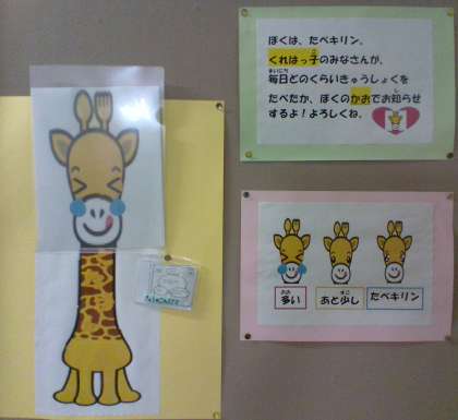 一人一人が毎日の給食に感謝して、のこさず食べるように心がければ、ごみや食品ロスの問題の解決にもつながります。呉羽小学校の食べキリンは、給食室前に掲示されています。その日の給食の残食量によって、キリンの表情が変わる工夫がされました。