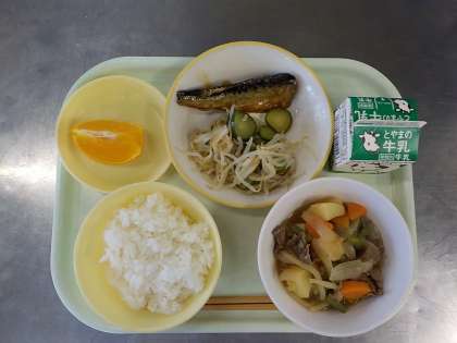 今日の献立は、ごはん、いわしの梅煮、甘酢和え、肉じゃが、あいか、牛乳でした。肉じゃがは、味がよくしみておいしかったです。柑橘系の「あいか」は、みかんより甘みが強く、その味に喜ぶ子どもの姿が見られました。