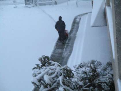 朝から雪が降り続いています。みなさんが安全に登校できるよう、学校の玄関前を除雪してくださっています。道路も雪でせまくなっているところもあります。車に気を付けて、手には何も持たずに、ランドセルかリュックで来てください。手袋や帽子等の防寒具もしっかりつけてきましょう。