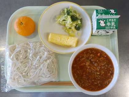今日の献立は、ソフト麺、ミートソース、卵ロール、グリーンサラダ、みかん、牛乳でした。ミートソースの中には、豆の仲間レンズ豆が入っていました。気付いた人は何人くらいいたのでしょうか。おいしく食べてもらえてよかったです。