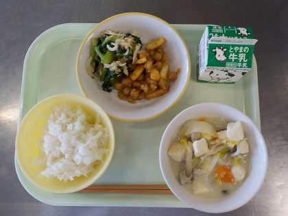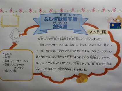 今日の給食 公開日 2023/01/23 更新日 2023/01/23 給食室より 今日から学校給食週間が始まりました。今年のテーマ「本の世界を味わおう〜読んで楽しい、食べておいしいお話〜」です。今日の献立は、ごはん、底なしイ〜カビーンズ、忍者ジンジャーのおひたし、塩こうじ鍋、牛乳でした。カレー風味のイカビーンズ、生姜の効いたジンジャーのおひたしは、よくかんで食べることができました。ごちそうさまでした。