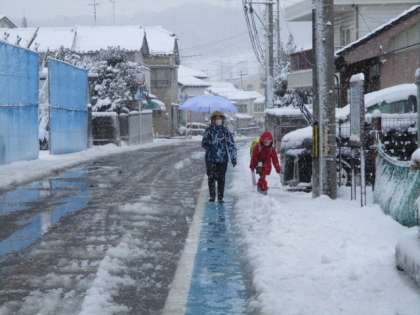 本日は通常登校としていましたが、子供たちは雪道を歩いても大丈夫な服装で、滑らないように気を付けて歩いたり、車道ではしっかり白線内を歩いたりする姿が見られました。